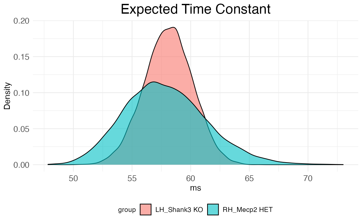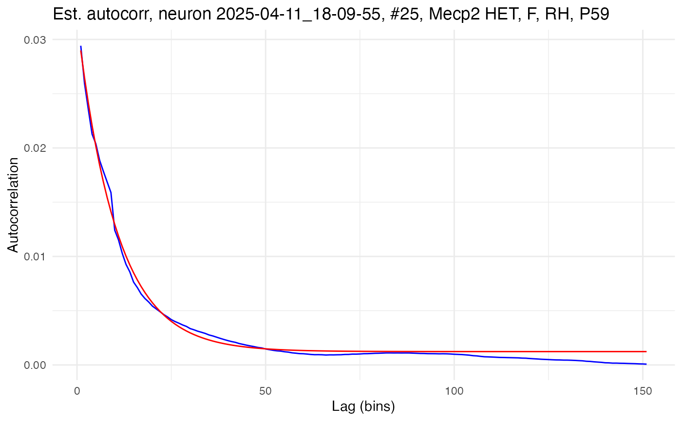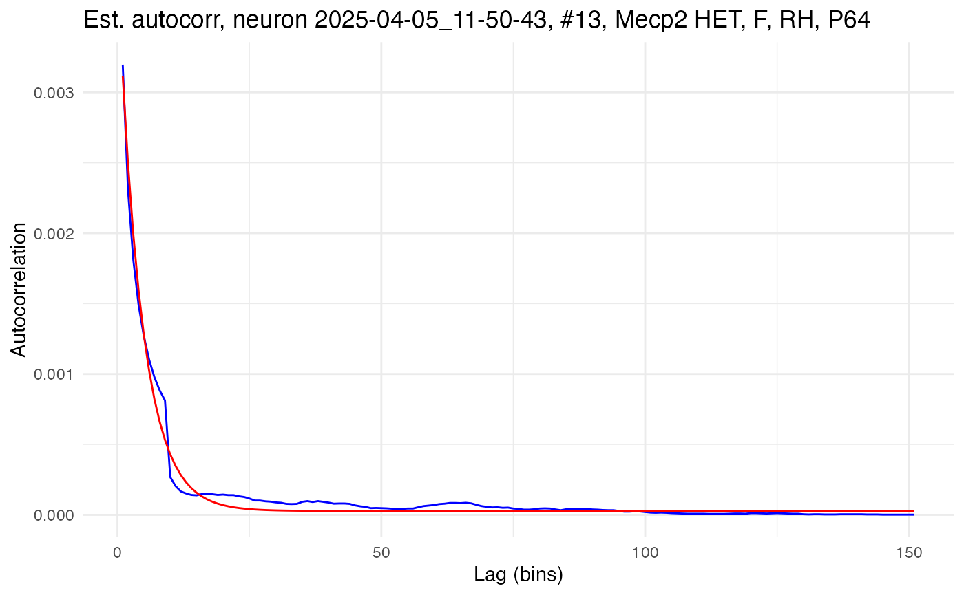 Recall that the aim is to estimate the network time constant for covariates of interest, e.g., in the right vs left hemisphere of C57 (wildtype) mice, or in the right hemisphere of C57 vs Shank3 KO mice. That is, the aim is not only to compute the empirical autocorrelation of a finite sample, but to estimate population values. At first glance, the output of process.autocorr appears to provide all that’s needed for this estimation. Why not simply take the covariate means of the values listed in the output of process.autocorr? The problem is that recurrence is very noisy, the amount of data available from which to extract a signal through all that noise is low, and itself is an imperfect measure of the network time constant. For example, a relatively flat empirical autocorrelation curve is ambiguous between high with low and low with high . Similarly, empirical autocorrelation values are highly sensitive to relatively arbitrary choices in data processing, as discussed in the tutorial on estimating network time constants.