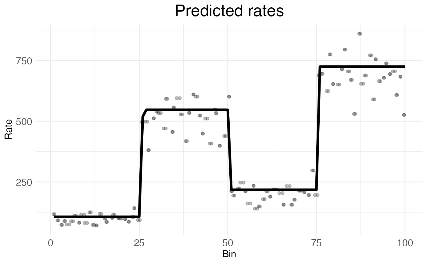 The above plot makes visually clear that the wisp is a good fit for the data. The wisp() function has identified the three rate-transition points dividing the data into four equal-sized blocks and, within each block, has identified a rate parameter which visually seems to land in the middle of the data.