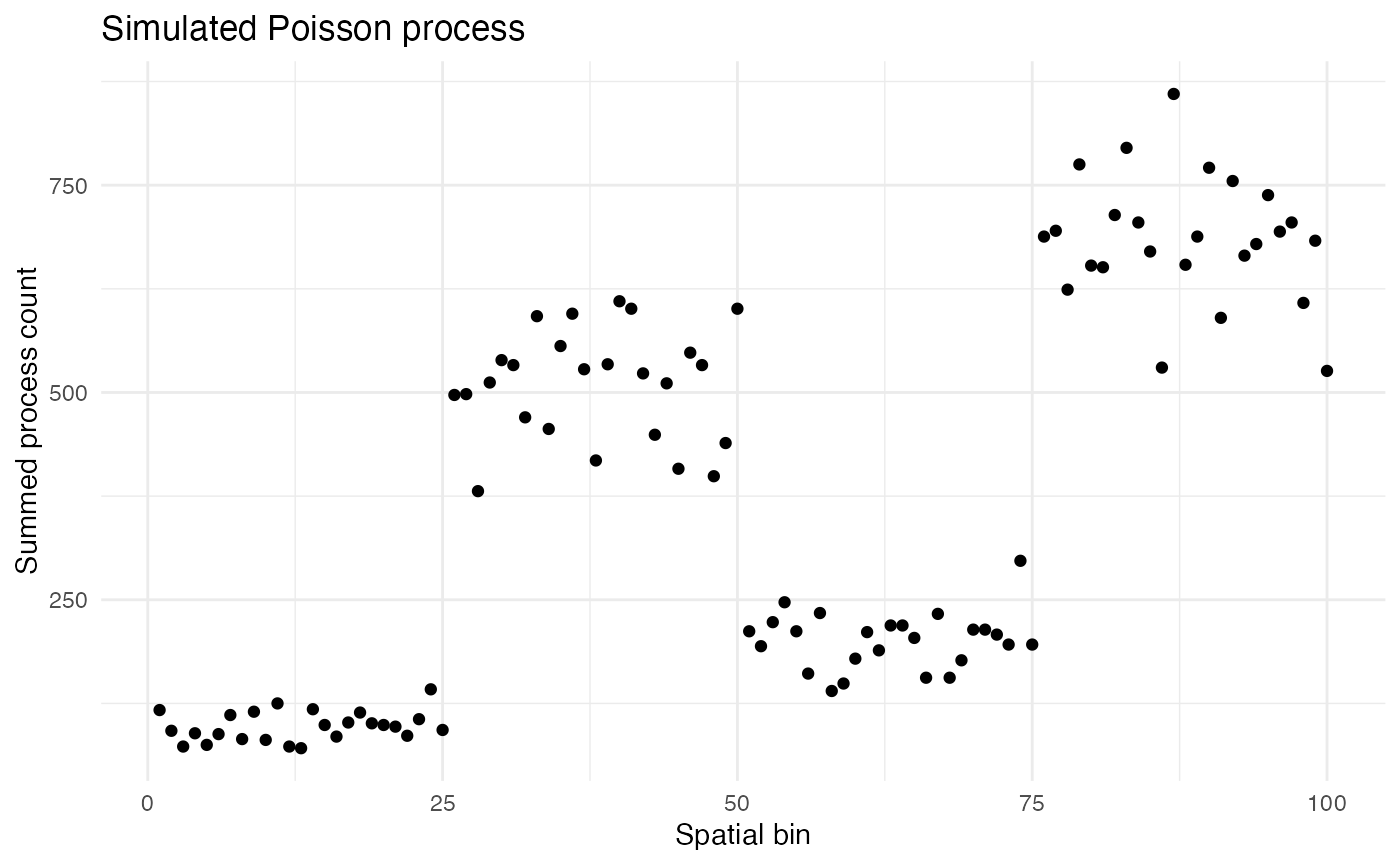bin <- sample(x, n_instances, replace = TRUE)Now suppose that the space is divided into four equal-sized blocks, each with a different constant process rate , and suppose there is a constant variance across the entire space. Suppose these rates are 1, 5, 2, and 7. We can represent this as a vector lambda of length 100, with each block’s rate repeated twenty-five times. The process counts can be simulated for each instance by pulling individual process rates from a gamma distribution and then drawing counts from a Poisson distribution with those rates: