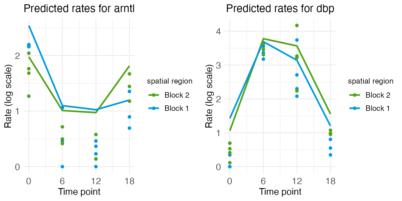 For the two rhythmic genes, the spatial rate-count plots show two times with relatively low and flat expression, along with two times with relatively high expression, although the central region of ARNTL shows a bit of a spatial gradient. For the portal region of ARNTL, ZT0 and ZT18 are elevated (yellow and purple), while for DBP it’s ZT6 and ZT12 (green and blue) that are elevated.