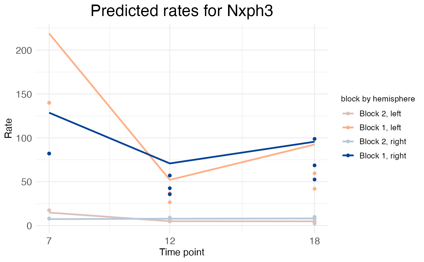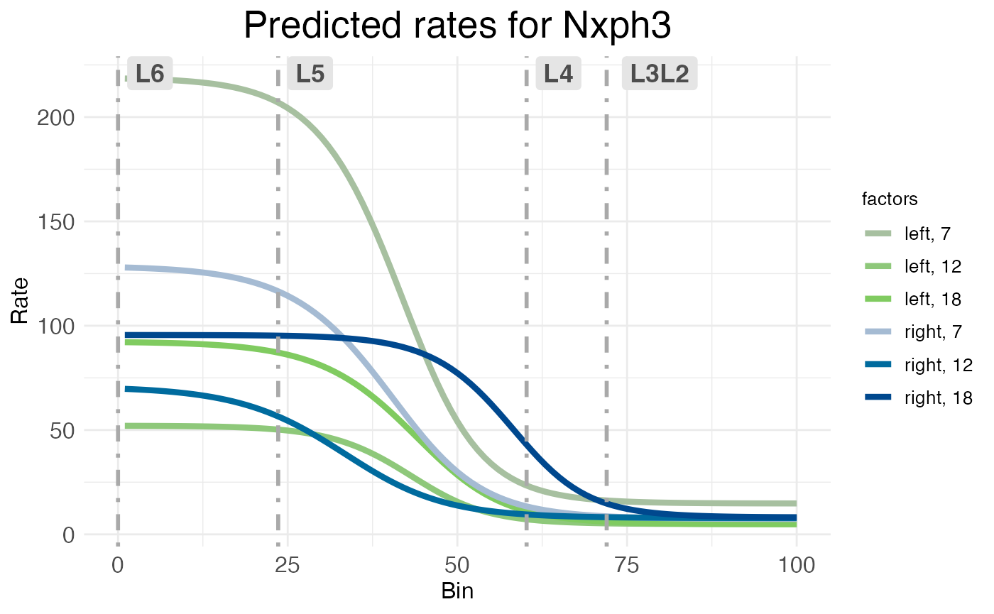 By default, when the timeseries factor is present, rate-count plots use an HCL color space, plotting time series as graduated luminance and the other factors as categorical levels of hue and chroma. In this case, left-hemisphere treatment levels are in green and right-hemisphere levels are in blue, with earlier time points dull and later time points brighter. This makes the lateralization easy to see: the dull green line for the left hemisphere at P7 is much higher than any of the blue lines for the right hemisphere. However, the temporal dynamics are harder to see and only shown implicitly. If you look closely, you should be able to see that (for the deep layers) for both left (green) and right (blue), the dullest line (P7) is the highest, the medium-brightness line (P12) is the lowest, and the brightest line (P18) is in between. This suggests that NXPH3 expression in deep layers dips at P12 relative to P7, then rises again in P18.
