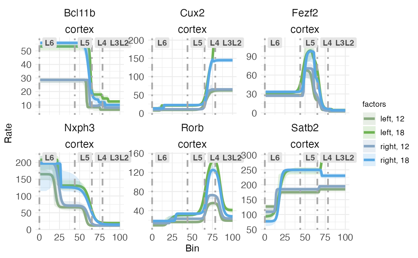 Both kinds of rate-count plots separate treatment conditions. In this data, we have two covariates, hemisphere and age, each with two levels (left vs right for hemisphere, P12 vs P18 for age). Thus, the plot shows the predications for the four possible combinations of covariates (i.e., the reference condition of left-12, plus three treatment conditions).