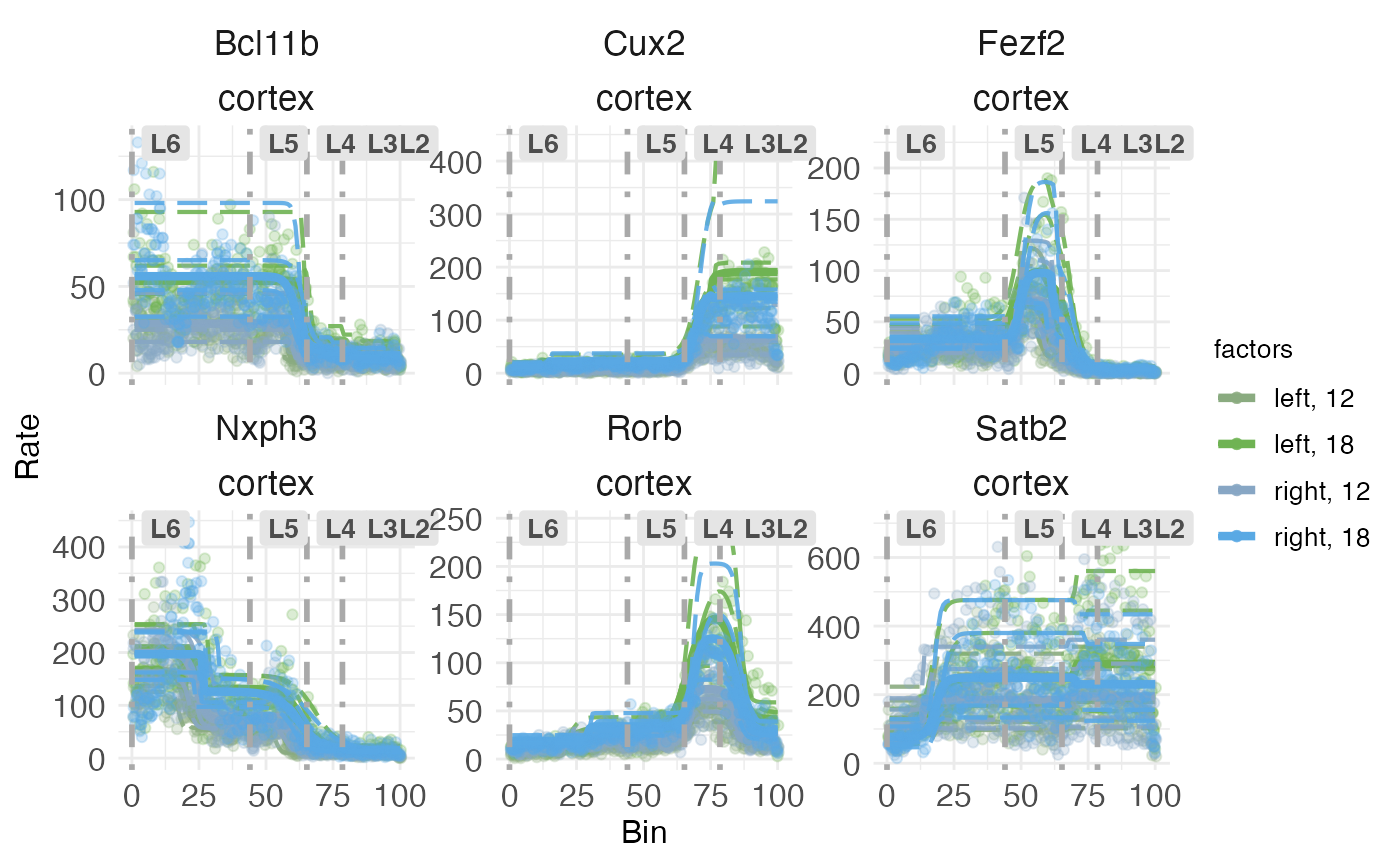 Notice how each plot has two dashed lines which fit the observed counts well, and two which do not. This is because the model is fit to each sample in all treatment conditions. The treatment conditions are got by the interaction of covariates hemisphere and age. Although each sample includes both hemispheres, it can only include one age. The model pulls information across samples to extrapolate the fit for the missing treatment conditions. Thus, some of the dashed lines represent fits to observed counts in treatment conditions that were not actually observed in that sample.